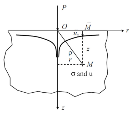 As for pavement design methods, homogeneous elastic materials can be easily accepted and are checked as Boussinesq’s solution for semi-infinite soils, and then Burminster’s model for multilayered structure. Semi-analytical methods are methods that were used many times in multilayered or contact problems. Unlike models using finite elements, these methods are simpler to use and are especially less consumer in terms of computation time. In a first approach, Reynaud [24] used this type of modeling in a calculation code named SAM to obtain the contact pressure at the surface during a tire contact. The tire and the pavement were defined as a smooth surface. The results compared to experimental results made it possible to define the contact areas and the stresses on the pavement surface. The semi-analytical method is based on the theory of semi-infinite elastic spaces. This method is the origin of the Hertzian contact. Let us suppose that an elastic half-space limited by the plane z = 0 where the boundary conditions at infinity in terms of displacement are null (see Figure 1).