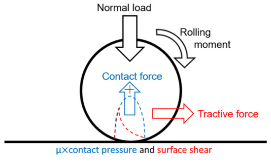 For this rolling contact problem, the formation of the contact is described by the normal problem. The rolling aspect is described by a tangential problem, which considers a tangential applied force and the friction law of Coulomb. The resolution of these two problems successively allows having the surface stress fields, including the distribution of the normal and tangential stress. Figure 3 shows the forces transmitted in the contact area.
