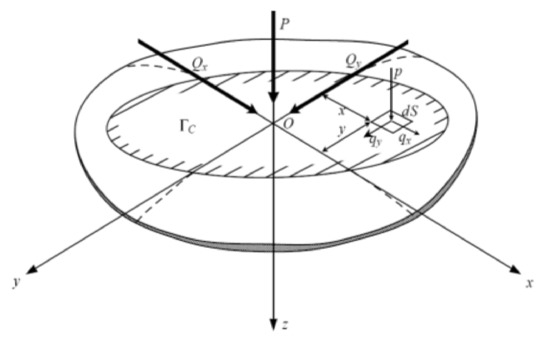 According to Love [25], the elastic displacement components at a point M(x,y,z) in the volume of body 2 are given by: