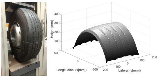 The first results prove that tire geometry has a great influence on the contact pressures. In order to better approach this geometry, a photogrammetry method was chosen to carry out the reconstruction of the tire surface. A Michelin (315/80R22.5) (Clermont Ferrand, France) tire is thus photographed with a good resolution camera. All pictures are digitally assembled using a software, allowing a recovery of more than 80% on each picture (Figure 4). A 3D image of the tire is then obtained under its actual conditions of use (at the average inflation pressure of 8.2 bars). Using the SAM code with these results, contact pressures can be calculated. A cubic mesh (3 mm × 3 mm × 3 mm) is chosen according to sensor precision [30]. This mesh allows the calculation time to be optimized. A study of the contact pressure with the help of a tribological approach was carried out by Manyo [31].