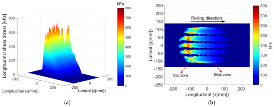 Figure 5 shows the distribution of the contact pressure field for a normal static load of 35 kN (inflation pressure is equal to 820 kPa). A good relationship between the numerical and experimental results is then observed. The area of the contact surfaces of the two results, as well as the maximum values of the contact pressure, are almost equivalent (58,761 mm2 for Tekscan and 59,553 mm2 for SAM, and 1532 kPa for Tekscan and 1576 kPa for SAM).