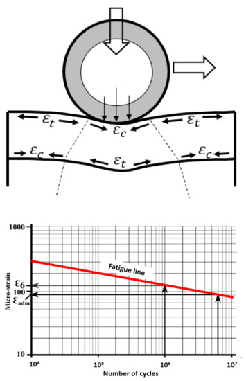 Finally, numerical results of strains are approximately equal to 35 µstrain maximum between tire treads during the free-rolling and 200 µstrain maximum at the edges during the tractive rolling contact. This is never observed by the models of the uniform load distribution hypothesis. In addition, results on the main strain directions also give us information on the direction of cracking (initiation of longitudinal or transverse cracks).