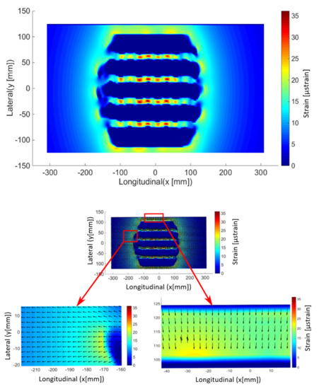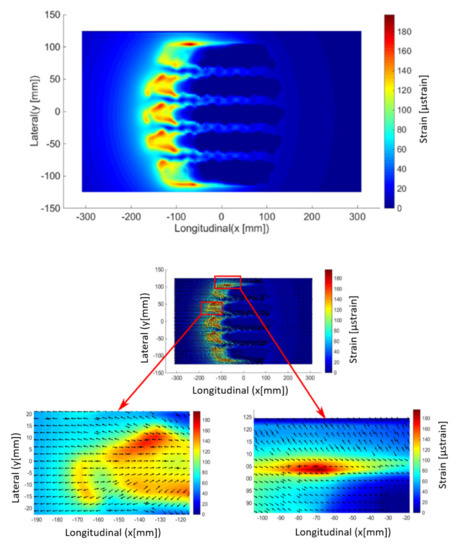 The objective of our modeling is to evaluate the effect of the tire on the surface and in the underlayer of the pavement in the presence of friction, particularly in the case of descending cracks. In the literature, the effect of the horizontal force only concern the surface layer where cracking begins and develops; this observation is given by Hammoum [33]. Therefore, the fields of maximum surface strain are presented in this section as well as the main directions. Figure 8 shows the principal strains by surface extension (z = 0) for the case of free rolling. The latter is modeled by a friction coefficient equal to 0.7 with no additional tangential load. It is observed that the peaks of high strains are between the tire grooves, which can also explain the cracking in the contact itself. On the other hand, we note that the maximum micro-strain (µdef) is around less than ε6. Figure 8 also shows the main directions of extension.