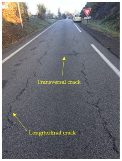 Figure 9 shows the main surface strain field for tractive rolling (described above by Kalker’s theory). The friction coefficient between the tire and the pavement μ = 0.7 and tractive force Qx = 10 kN (see Table 1). The effect of the sliding zone (tractive rolling) on the pavement degradations is clearly observed. Note that it is in this sliding zone that the peaks of micro-strain are higher and more precisely on the edges of the contact and are of the order of 200, which is almost twice that of ε6. In this case, the cracking is then obvious for a very short life. This model also gives us information on the cracks in any direction. Figure 9 shows the main directions of extension in the case of the tractive bearing. In this case, some directions are almost oblique. As can be seen on pavements (for example see Figure 10), longitudinal as well as transverse cracks appear. Then, in principle, we will note that the directions orthogonal to the direction of the bearing are at the origin of the longitudinal cracks, and those parallel to the direction of the bearing are at the origin of the transverse cracks.