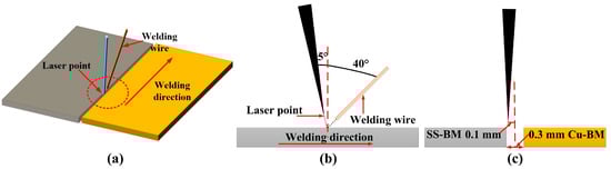 The welding machine was an RC-YLS-2000 continuous fiber laser (IPG, New York, NY, USA) with a rated power of 2 kW and the diameter of the laser beam was 0.2 mm. In order to remove the oxide film, sandpaper was used to the polish samples before the welding. Welding tests were carried out on the butt joint and 99.99% pure argon gas (with a flow rate of 10 L/min) was adapted to protect the weld bead. As shown in Figure 1, the constant parameters were: inclination angle of the welding wire was 40° and the vertical direction of the laser was 5°. The gap between Cu/SS was set to 0.3 mm to match the wire diameter of 1.2 mm. The offset of the laser beam was set to 0.1 mm on the SS side due to the high reflection of Cu.
