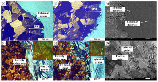Figure 5 shows optical micrographs of the Cu/weld interface, indicated in Figure 3. Our results showed that obvious fusion lines were found at both C1 and C2 of joint 1 and the columnar grains grew perpendicular to the fusion line (Figure 5a,b). Since the high thermal conductivity of Cu (398 W/mK) would result in a temperature gradient at the Cu/weld, the nucleation and growth of column grains was promoted. Moreover, an unmixed zone (UZ) adjacent to the Cu/weld interface was found (Figure 5a,b) and the coarse grains in the UZ of both the top and bottom parts were integral, indicating that part of the Cu was not melted during the welding process []. However, due to the high thermal conductivity of Cu, a large portion of the heat was conducted from the unmelted Cu to Cu-HAZ, and thus led to grain-coarsening in Cu-HAZ from the annealing effect in joint 1. It is worth noting that equiaxed dendrites and columnar dendrites were observed in the SEM analysis (Figure 5c). However, there were different microstructures at the Cu/weld interface (C1, C2) in joint 2. Several SS microstructures were found at the Cu-BM due to the convection effect in the molten pool. Since a portion of heat would be lost through the welding zone, the amount of the heat input at the Cu/weld interface was small and the combined high cooling rate of wire-fed laser welding led to a supercooling effect. There was a partially melted zone (PMZ) composed of melted copper materials and Ni-based phases (Figure 5d,e). It is noteworthy that grain refinement was obtained and is shown in the enlarged micrographs of Figure 5d,e. This may be caused by the heterogeneous nucleation in the promotion of the SS islands. Our results were consistent with a previous study []. Moreover, fine spherical steel grains with extremely small sizes were observed in both C1 and C2 (Figure 5d,e) due to the supercooling effect on the Cu/weld interface. Moreover, fine Cu grains and spherical grains were also observed in the SEM micrographs (Figure 5f). The grain refinement would facilitate the hardness elevation at the Cu/weld interface.