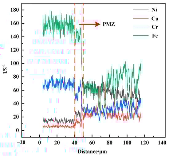 Figure 6 shows optical micrographs of the SS/weld interface. The SS/weld interface of both joints were joined by a fusion mode with a typical partially melted zone. As shown in Figure 6a,b, the SS/weld interface exhibited a typical cellular grain growth across the fusion line of joint 1, and, due to the low temperature gradient and high solidification rate of the weld zone, the solidification mode transformed into a mixture of columnar and equiaxed dendrites. As shown in Figure 6d,e, the SS/weld interfaces (S1 and S2) of joint 2 exhibited columnar dendrites and cellular dendrites grew along the maximum temperature gradient from the SS-BM to the weld zone. Significantly, an unmixed zone (UZ) was observed at the SS/weld interface in joint 2 (Figure 6f), and this result was demonstrated by EDS line scanning analysis (Figure 7). As the melting temperature of the weld material was lower than that of SS-BM, a small portion of melted SS-BM metals which was not completely mixed with the weld metals, solidified first; thus, a thin UZ at the SS/weld interface was formed []. Compared to the weld metal and BM, an UZ is more susceptible to corrosion []. Thus, attempts have been made to eliminate UZs []. In this study, the thin UZ at the SS/weld zone interface indicated that a better bimetallic joining was obtained between the SS/weld zone. The solidification modes of the SS/weld interface are totally controlled by solidification parameters, such as temperature gradients and solidification rates.
