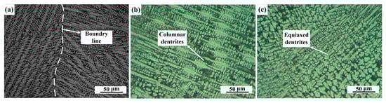 Figure 8 shows optical micrographs of the weld zones of the joints. Our results showed that columnar dendritic and cellular dendritic solidification modes were formed with distinct solidified sub-grain boundaries in joint 1 (Figure 8a). It is worth recalling that there was a boundary of solidified grains in the middle of the weld, where the microstructures of each side were different. It is obvious that typical cellular grains were on the Cu side while columnar dendrites were on the 301 SS side (Figure 8a), which may have resulted from thermal gradients and supercooling. However, the microstructure in the weld zone of joint 2 was different from that of joint 1 (Figure 8b,c); the weld zone of the SS side was composed of columnar dendrites that grew perpendicularly to the fusion line with primary dendrite arms and secondary dendrite arms (Figure 8b). Additionally, a great quantity of equiaxed dendrites were randomly distributed in the middle of the weld (Figure 8c), which was caused by supercooling due to the dendritic solidification process. Thus, the combined effects received from the constitutional supercooling, as well as the composition and solidification gradients in the fusion zone, produced a complex dendritic solidification structure across the fusion zone.