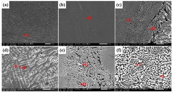 SEM micrographs in the weld zones: (a–c) joint 1 and (d–f) joint 2.