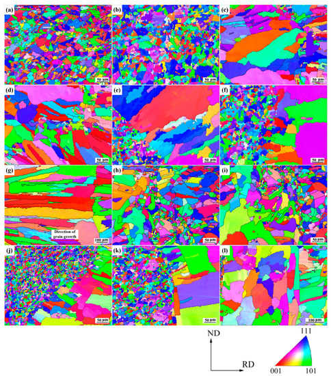 EBSD-IPF micrographs of local weld sub-regions: (a) Cu-BM; (b) SS-BM; joint 1: (c) C1; (d) C2; (e) S1; (f) S2; (g) weld zone; joint 2: (h) C1; (i) C2; (j) S1; (k) S2; and (l) weld zone.