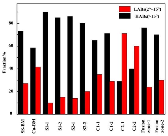 Figure 11 shows the grain boundary distributions of the weld sub-regions. The orientation angles in the range of 2–15° referred to the low-angle boundaries (LABs) of the grain, and the remaining grain boundaries (>15°) were counted as high-angle boundaries (HABs). Our results showed that the proportion of HABs at the SS/weld interface of both joints were high, resulting from the solidification mode of the SS/weld interface being plane solidification and columnar dendritic solidification. The proportion of HABs at the S1 and S2 of joint 1 were 90.1%, 85.4% respectively and that of joint 2 were 86.7%, 80.8% respectively. Thus, formation of the large angle grain boundaries between coarse grains was without the production of sub-grain structures. As the laser beam in the weld was offset to the SS side in both joints, orientation angles in the weld zone of both joints (75.9%, 70.3% of HABs) were similar to those of the SS/weld interface. Significantly, there were twins inside the coarse copper grains, but there was still a relatively high proportion of HABs at the Cu/weld interface (65.4%, 71.2% of HABs) in joint 1. However, the orientation angle at the Cu/weld interface of joint 2 (28.6%, 37.4% of HABs) was different to that of joint 1, which was caused by grain refinement that occurred along the Cu/weld interface under the supercooling effect. The crystallographic relationships between the morphology of grains and corresponding misorientations were highlighted by the local misorientations information.