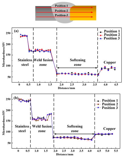 Microhardness distributions across the welds of joints: (a) joint 1 and (b) joint 2.