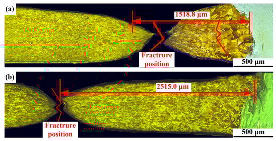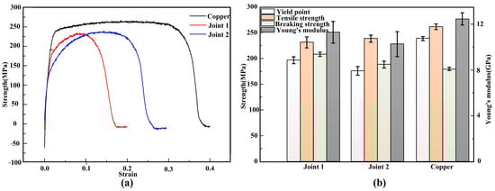 Figure 13 shows the engineering stress–strain curves (Figure 13a), yield point, tensile strength, breaking strength and Young’s modulus of different joints (Figure 13b). The tensile strengths of joint 1 and joint 2 were 231.3 MPa and 238.7 MPa, respectively, on 88.5% and 91.2% of the copper plate. As shown in Figure 14, there was no obvious deformation in the joint during the tests. Moreover, a larger stretched softened zone was observed in joints filled with ERNiCu-7 filler metal, which indicated that the deformation of the Ni-Cu-based filled joint was higher. As shown in Figure 15, both joints fractured at area 2 of the Cu-HAZ, and the tensile strength of both joints was less than that of Cu due to the softening in the Cu-HAZ, which was caused by grain-coarsening and a decreased dislocation density under heat conduction []. As shown in Figure 16, the failure location of both joints exhibited a fibrous surface with dimples, indicating that both joints fractured in a ductile pattern.