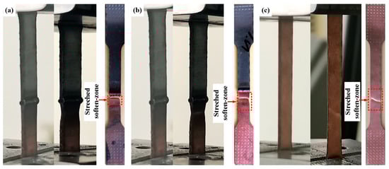 The specimens of the joints mounted on the testing machine at the beginning of the test, during the test and at the end: (a) specimen of 600 alloy filled joint; (b) specimen of ERNiCu-7 filled joint; and (c) specimen of pure Cu.