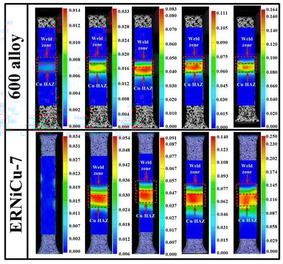 Figure 17 shows the progressive 2D-DIC strain maps derived from the joints. Results showed that the strain gradient in the initial joint was very low, and most of the strain was distributed to the Cu-HAZ and the weld zone. However, localization of the strain was obvious, and a large amount of strain accumulated in the Cu-HAZ as the specimen experienced plastic deformation. These results indicated that the Cu-HAZ was weakest zone in the joint. As the 301 stainless steel had a high tensile resistance, there was almost no plastic deformation (strain < 5%) in the SS-BM of joint 1 and joint 2. In addition, due to the high tensile resistance of the Ni-based solid solution in the weld of joint 1, the metal strained within 6% and it is interesting to note that the strain concentration of the Cu/weld interface was more obvious in joint 1 than that in joint 2.