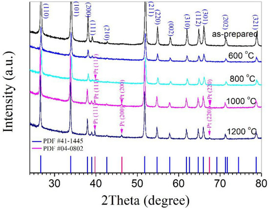 Other pressed pellets were sintered in air for 2 h at 600, 800, 1000, and 1200 °C, separately. Finally, a pair of rectangular Au electrodes was formed on the sintered pellets through DC magnetron sputtering.