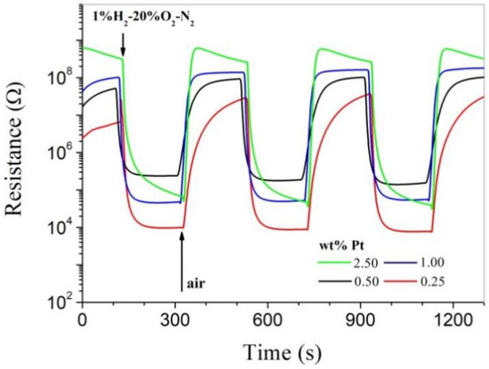 Though Pt was in a low crystalline state in as-prepared powders, highly impressive room-temperature hydrogen-sensing characteristics were observed for all as-pressed pellets, as shown in Figure 3. All samples respond strongly to hydrogen at room temperature, and it can be clearly seen that their resistance in air increases dramatically with increasing Pt content. For the Pd-SnO2 system, it has been clearly revealed that Pd is able to promote oxygen chemisorption on SnO2 at room temperature [7]. As a similar catalytic metal, Pt should also be able to promote oxygen chemisorption on SnO2 at room temperature, which results in increasing resistance with increasing Pt content for the as-pressed pellets. The sensitivity of a gas sensor is usually defined as Ra/Rg, where Ra and Rg are the electrical resistances of the sensor in clean air and in the measuring gas, respectively [7]. The sensitivity is over 100 for all as-pressed pellets, and that of the pellet of 1.00 wt% is around 2000 for 1.0% H2-20% O2-N2, with both fast response and recovery speeds. Obviously, the room-temperature hydrogen-sensing characteristics have been successfully characterized for the Pt-SnO2 nanoparticles in this convenient way, which are highly outstanding when compared with those reported for other low-dimensional MOX nanocrystals in the literature [3,4]. On the other hand, however, the as-pressed pellets cannot be regarded as bulk materials and are not stable enough for any practical applications. For example, they will collapse when immersed in water.