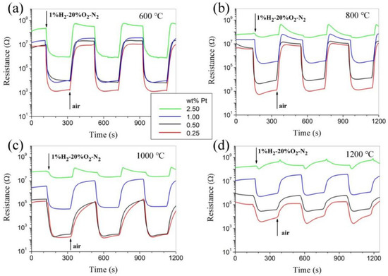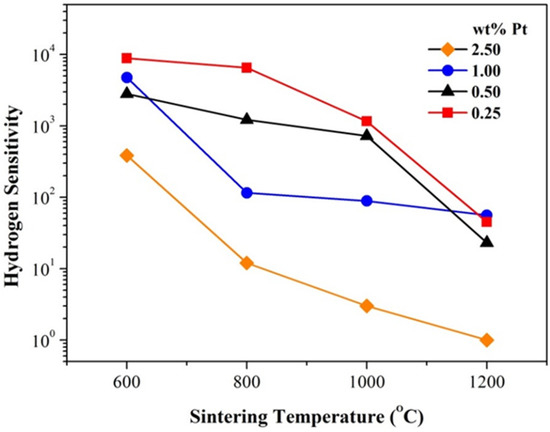 Sensitivity is one of the most important properties for gas sensors. From the data in Figure 5, it can be drawn that for samples of the same Pt content, the hydrogen sensitivity decreases obviously with increasing sintering temperature, as shown in Figure 7. It should be pointed out that the room-temperature hydrogen sensitivity is still highly impressive for those pellets of 0.25 and 0.50 wt% Pt and sintered at 600 and 800 °C. Obviously, traditional pressing-and-sintering technology has thus demonstrated great potential for preparing high-performance room-temperature gas-sensitive bulk MOXs.