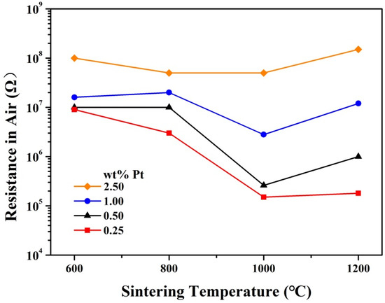 The resistance of the samples exhibits a relatively complicated dependence on the sintering temperature. As shown in Figure 6, for samples with 1.00 and 2.50 wt% Pt, the resistance remains roughly unchanged for various sintering temperatures, while for samples with 0.25 and 0.50 wt% Pt, the resistance is much smaller for sintering temperatures of 1000 and 1200 °C than that for sintering temperatures of 600 and 800 °C. Namely, these samples of 0.25 and 0.50 wt% Pt show obviously smaller resistance for relatively high sintering temperatures. To account for this complicated dependence, the resistance of Pt-SnO2 nanoceramics should be divided into two parts: The resistance of SnO2 grains and that of SnO2 grain-boundaries. As the connectivity between SnO2 grains increases with increasing sintering temperature, the resistance of SnO2 grain-boundaries should decrease with increasing sintering temperature. For samples with 0.25 and 0.50 wt% Pt, the resistance of SnO2 grains is relatively small due to the small Pt contents, and their overall resistance must be dominated by that of SnO2 grain-boundaries, which decreases with increasing sintering temperature, and the overall resistance is thus much smaller for sintering temperatures of 1000 and 1200 °C. For samples with 1.00 and 2.50 wt% Pt, however, the resistance of SnO2 grains is quite high due to the oxygen chemisorption on SnO2, which results in the relatively high overall resistance observed even for these samples sintered at 1000 and 1200 °C when the resistance of SnO2 grain-boundaries in these samples is greatly decreased. Such an evolution of resistance with sintering temperature should reflect the connecting process between SnO2 grains at high temperatures in some way.
