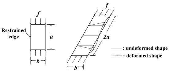 The flange models analyzed in this study were supported by a hinge and fixed boundary conditions, including web constraints. If the web is thick, it is similar to a fixed support condition, which does not allow displacement or rotation. If the web is considerably thin, it allows an almost free rotation, similar to the hinge boundary condition. In practical scenarios, steel I-girder flanges supported by one web are generally located between the hinge and fixed boundary conditions, as indicated in Equation (7). However, in the case of UHPC flanges, the web constraints can be considered as fixed boundary conditions, because thick UHPC webs with shear rebars are preferred to secure sufficient shear resistance capacity. In this study, the two boundary conditions were compared for the purpose of theoretical investigations. The analysis results were evaluated in terms of the critical buckling strength and post-buckling behavior of the UHPC flanges.