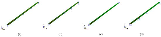 Compressive load and boundary conditions. (a) Hinge supports: displacement constrains along the Z-axis; (b) fixed supports: displacement constraints along the Z-axis and rotations along the Y-axis; (c) uniform loads at each end for the hinge and fixed condition; and (d) support along the Z-axis for the hinge and fixed conditions.