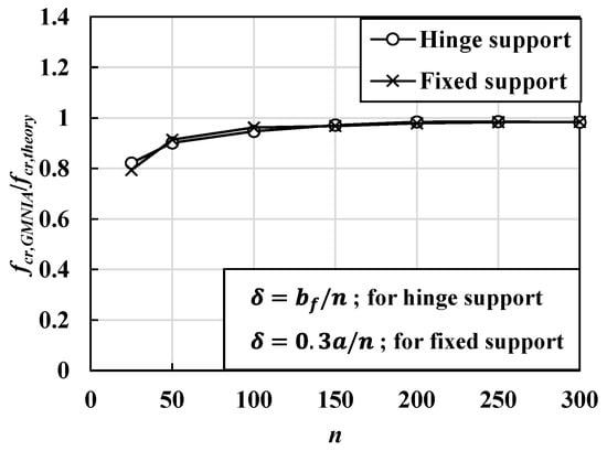 Figure 10 shows the local buckling mode shapes obtained from the elastic buckling analysis for the hinge and fixed boundary conditions. The buckling mode shape for the GMNIA was determined based on the nodal displacements of the 1st mode shapes, obtained from the elastic buckling analysis results. Figure 11 shows the elastic buckling strength corresponding to the magnitude of initial imperfections, obtained using the GMNIA. Based on the convergence analysis, the maximum initial imperfections were determined to be 6.67 mm () for the hinged condition and 1.625 mm () for the fixed condition, based on the AWS Bridge Welding Code [29], as the convergence analysis for the two boundary conditions yields appropriate estimations.