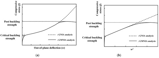 The critical local buckling of flanges occurs within the elastic range during the initial stage of the compression load; out-of-plane deflection starts to be developed after the compressive stress reaches the critical buckling strength. With respect to the post-buckling behavior, the applied loading can be gradually increased until it reaches ultimate strength with large out-of-plane deformation. The ultimate strength can be defined as the post-buckling strength. Several studies have reported methods to determine critical local buckling strengths [30]. In this study, was used to approximate the lower boundary critical buckling strength of UHPC flanges. For a conventional curve, the equilibrium path has a nonlinear relationship, as shown in Figure 12a. If the curve is transformed to the curve, the equilibrium path exhibited an approximately linear relationship, as shown by the dotted line in Figure 12b. Thereafter, the intersection points between the straight line extending from the equilibrium path and the axis can be defined as the approximate critical buckling strength. The ultimate buckling strength after the critical buckling strength can be defined as the post local buckling strength of these flanges.