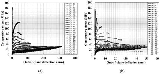 Relationship between compressive stress and out-of-plane deflection for UHPC flanges modeled using the CDP material model according to slenderness ratio (): (a) hinge support condition and (b) fixed support condition.
