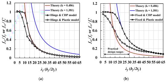 Figure 13 shows the compressive stress and out-of-plane deflection relationships of the flanges, as simulated by the plastic model. As plotted in Figure 13, typical critical buckling and post-buckling behavior that demonstrated the same trend (Figure 12a) were observed. The critical and post-buckling strengths increase as the slenderness ratio decreases. The post-buckling strength of the plastic model was considerably higher than the measured approximate critical buckling strength when the slenderness ratio exceeded approximately 12.5 and 22.5 for the hinge and fixed boundary conditions, respectively. If the slenderness ratio is below these values, the material nonlinearity becomes a controlling factor instead of geometrical nonlinearity. In these cases, as it is difficult to distinguish between critical buckling and post-buckling states, the maximum strength can be considered as the ultimate strength of the flange.