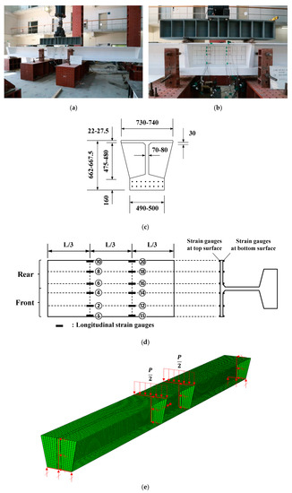 Lee [23] investigated the local buckling behavior of UHPC flanges subjected to pure compression based on experimental tests (Figure 16a). The girder specimens with a three-different thickness of thin-walled flanges were made and four-point bending loading was applied using spreader beams to introduce pure compression of the flanges on the test zone (Figure 16b). The specimens have 22–27.5 mm flange thickness with 730 mm and 740 mm width to induce flange local buckling (Figure 16c). UHPC concrete used for producing the specimens has 162 MPa of compressive strength, and 47,166 MPa of young’s modulus, which was determined by axial compression material tests. For tensile behavior, three-point bending tests were conducted to measure crack width (). Using the measured crack displacement, crack width at tensile strength () and crack width at zero strength beyond the tensile strength () were determined. Tensile strength was determined by which is a lower boundary strength suggested by Graybeal [3]. The summary of the material test results was listed in Table 5. To earn critical strain rates when the flanges of test specimens buckle, longitudinal strain values of the top and bottom side of flanges were measured during the tests (Figure 16d). Three-dimensional finite element analysis models for evaluating the test specimens considering the local buckling behavior were established in their research. Four-point loadings and simply supported boundary conditions with lateral supports to prevent overturning of the specimens used in the test were applied in the presented FEA models to simulate similar structural behavior of test specimens as possible as shown in Figure 16e.