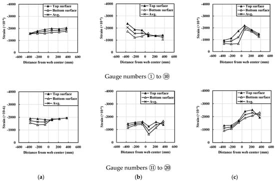 Compressive strain distributions in the longitudinal direction of UHPFRC flanges: (a) specimen #1, (b) specimen #2, and (c) specimen #3 (data from reference [23]).