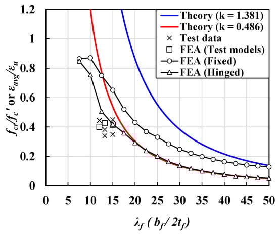 Figure 18 shows a comparison of maximum average strain values from the test data and maximum stress values based on flange models established in this study. Additionally, the maximum stress values based on 3D FEA models corresponding to the test specimens presented in the literature [23] also compared. The finite element analysis was conducted based on the material test data in Table 5. Maximum stress values according to the slenderness ratio were analyzed based on the analysis results simulated with the same analysis approaches presented in the previous section. Based on measured data from the literature, 3 mm of initial imperfections were applied. As shown in Figure 18, the test data shows similar trends compared with finite element analysis results. The test data were located at lower parts of the graph than the analysis results of fixed and hinge boundary conditions. All test data shows better correlations with hinged boundary conditions. Considering the uncertainty of the material properties of concrete and realistic boundary conditions, the test results may show good correlations with the presented finite element analysis.