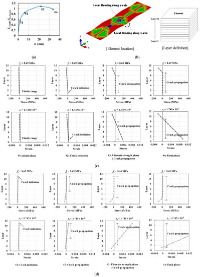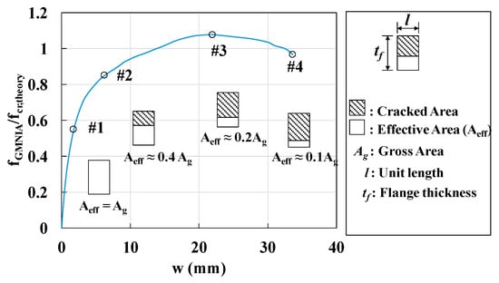 In the case of the CDP material model, the first crack occurred due to the transverse stress and strain along the web line (refer to phase #1 in Figure 21d). After the initiation of the crack, the stiffness of the compressive stress and out-of-plane displacement curve exhibited a decline (refer to phase #1 in Figure 21a), because the effective compressive area started decreasing due to crack propagation. Second, the strain along the longitudinal direction resulted in a crack at the flange tips (refer to phase #2 in Figure 21c); these cracks propagated via the transverse stress along the web line, leading to a significant reduction in stiffness (refer to phase #2 in Figure 21d). Third, crack propagation increased along with the longitudinal and transverse directions until the ultimate strength state was reached (refer to phase #3 in Figure 21a–d). A further increase in strength was not observed owing to the decrease in the effective compressive area, which was caused by changes in the neutral axis of the flanges due to crack propagation (refer to phase #4 in Figure 21a–d).