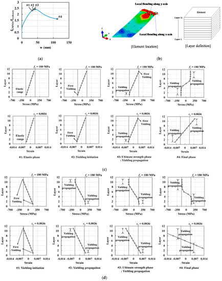Comparisons of compressive stress and strain for ordinary steel flanges, modeled using the plastic material model, according to loading phases: (a) definition of loading sequence, (b) definition of local bending location and element layers, (c) normal stress distribution of local bending along the X-axis, and (d) normal stress distribution of local bending along the Y-axis.