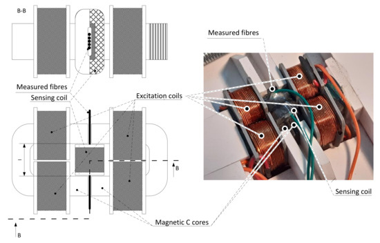 These changes of magnetic resistance and inductivity are more significant in the state where fibres are not magnetically saturated. However, it is possible to measure this phenomenon. The larger part of the space in the magnetic circuit is still air and, therefore, no differences between the different fibres’ positions and volume are observed.