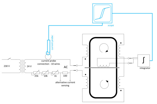 The overall measurement schematic is in Figure 2. The source of the excitation current was measured by a current probe. To increase the sensitivity, the current was measured on ten turns of the power conductor. The sensing coil’s output voltage was integrated and, together with the input current, was used as an input signal for a digital oscilloscope (Keysight DSOX2022A, Santa Rosa, CA, USA) operating in XY mode.
