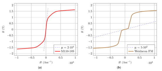 Measured magnetic characteristics. (a) Oriented silicon steel M110-185, C22. (b) Fibre Wiedacon FM.