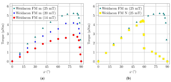 Simulation of the moment acting on the fibres depending on the angle of the fibre rotation. Fibres magnetized (m) and non-magnetized (N). (a) Different magnetic field intensities. (b) Different magnetization characteristics of the same fibre.