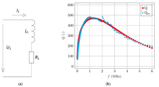 (a) Equivalent circuit of an air coil (L1 = Ls; R1 = Rs). (b) Air coil’s measured and calculated Q factors.