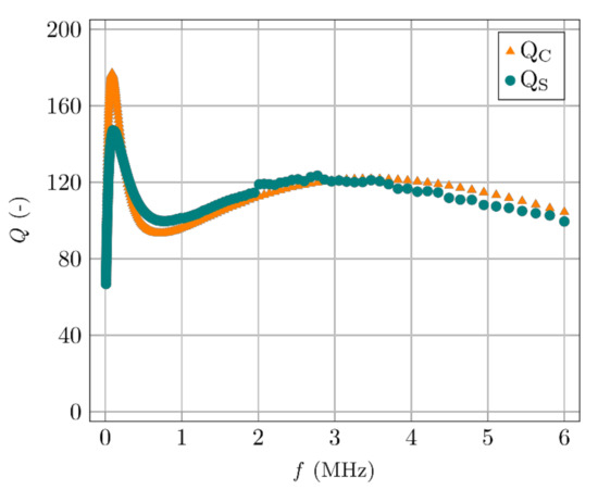 The values of constants a, b, c, can be found such that the approximate frequency dependency of the coil’s quality factor, in a wide frequency range, corresponds to the measured values. An example of the measured dependency (Qm) and the calculation (Q) for the measuring coil (described in the following text) is shown in Figure 8.