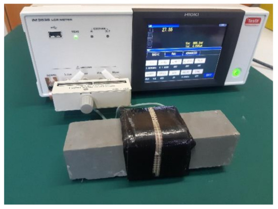 The measuring coil for the smaller specimens had a square cross-section and tightly encircled the measured material. The square cross-section coil was made from copper wire, with a cross-section area of 2.5 mm2 and 29 turns (Figure 11). The bigger specimens were measured using a circuit coil with a diameter of 155 mm and a length of 105 mm, made of 15 turns of copper wire, and with a cross-section area of 16 mm2 (Figure 12). All measurements of the quality factor Q were made with the impedance meter HIOKI IM3536 (HIOKI, Negano, Japan).