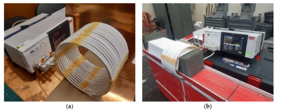 (a) The assembled larger measuring coil. (b) The setup for quality factor measurements for 100 mm × 100 mm × 400 mm specimens.