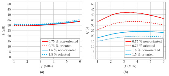 Initially, four smaller specimens were manufactured and tested: two with 0.75% and two with 1.5% fibre volume. One specimen from each sample had its fibres oriented by a magnetic field. Figure 13a shows the comparison between the dependency of inductance and Figure 13b shows the quality factor for different fibre volume and fibre orientation.