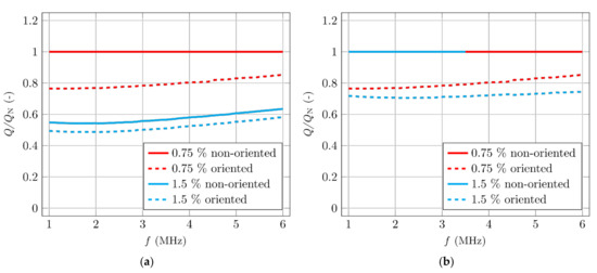 The dependency of the change of the quality factor. (a) Norm is a specimen with the lowest fibre content and the highest quality factor. (b) Norms are the non-oriented specimens.