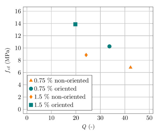 The most important comparison is between the measured quality factor and the achieved mechanical properties of the specimens. Figure 15 shows the quality factors and flexural strengths (fcf) of the same aforementioned specimens, measured using a three-point bending experiment. Fibre orientation was further verified by CT scanning. Higher fibre content corresponds to a lower quality factor and higher flexural strength. Better fibre orientation corresponds to a lower quality factor and higher flexural strength.