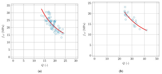 Comparison of the flexural strengths and measurements of the quality factor Q. (a) 40 mm × 40 mm × 160 mm specimens. (b) 100 mm × 100 mm × 400 mm specimens.