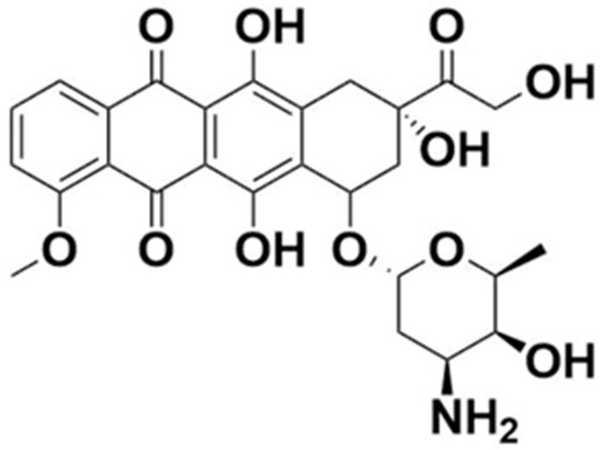 Structurally, DOX is a glycoside of anthracyclinone. It contains an anthraquinone chromophore placed within a planar aromatic system of four cycles, bound by a glycosidic bond to daunosamine (Figure 1). Anthraquinone groups can participate in redox reactions, contributing to the generation of reactive chemical species, which might be associated with anthracycline cardiotoxicity [5].