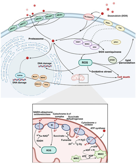 Apart from its well–established topoisomerase II–mediated cytotoxicity, DOX, while undergoing intracellular oxidation and reduction cycles, leads to the generation of reactive oxygen species. This exposes nuclear and mitochondrial DNA to oxidative stress and can exert additional cytotoxic effects [18,19]. Indeed, oxidized DNA bases are detected in the blood and urine of patients treated with DOX [20,21]. Additionally, DOX was shown to form covalent adducts with DNA, which can induce apoptosis, further contributing to the overall cytotoxic activity of the drug [22,23]. All in all, at DOX concentrations reflecting peak plasma concentration during treatment, targeting topoisomerase II seems to be the primary mechanism of antitumor action, whereas, at higher drug concentrations, the toxicity of free radicals and DNA cross–linking may become relevant [24].