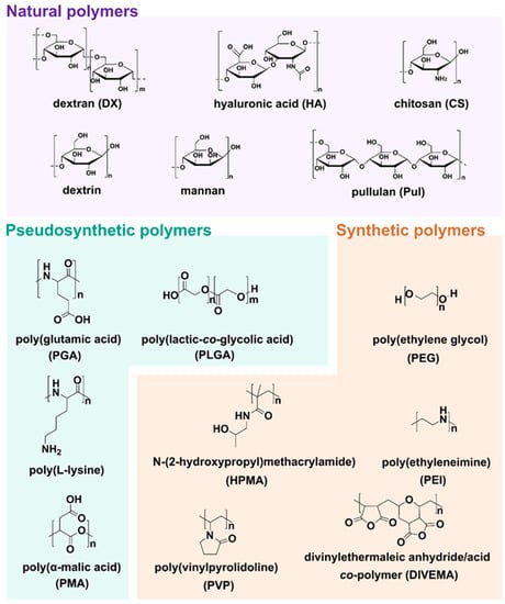 Structures of natural, pseudosynthetic, and synthetic polymers used for drug delivery applications.