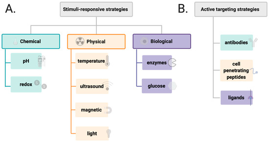 Further studies showed that polymers can be combined with inorganic nanoparticles and small molecules to create stimuli-responsive or targeted DDSs (Figure 5) [70,71,72,73]. The targeting of DDSs focuses on both active targeting and improving the efficacy by stimuli–responsive approaches. For example, monoclonal antibodies (mAbs) are becoming increasingly popular, i.e., trastuzumab, cetuximab, or bevacizumab, and, apart from their intrinsic anticancer activity, are proposed to be used for selective delivery of antineoplastic drugs to tumors [74,75,76,77]. Additionally, to achieve active targeting, a large number of ligands have been employed, including polysaccharides and peptides (i.e., hyaluronic acid and RGD peptide), as well as small molecules like folate or anisamidephenylbornic acid [78,79]. Furthermore, overexpression of enzymes, i.e., proteases, is another approach that can be used to design responsive DDSs [80,81]. In the enzyme–sensitive DDSs, the peptide side chain is designed as a specific substrate of a target enzyme that could directly release the drug from a carrier. Other promising strategies include chemical stimuli–responsive DDSs that can release the drug from a carrier by pH changes and using acid–labile or redox–responsive chemical bonds [82,83]. Among the common physical stimuli, thermo/magnetic-responsiveness and light/ultrasound-triggered stimulus are the most frequently used [84,85,86]. For all these features, targeting strategies of DDSs present an exciting approach for anticancer treatment.
